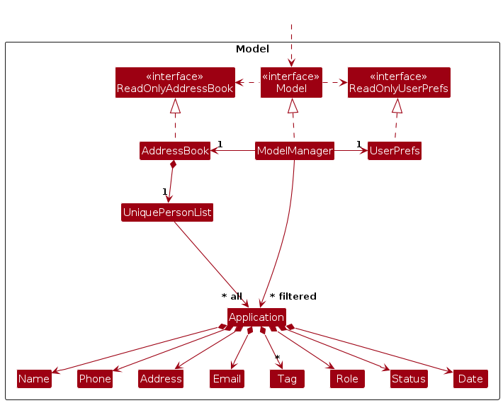 Person objects (which are contained in a UniquePersonList object).Person objects (e.g., results of a search query) as a separate filtered list which is exposed to outsiders as an unmodifiable ObservableList<Person> that can be 'observed' e.g. the UI can be bound to this list so that the UI automatically updates when the data in the list change.UserPref object that represents the user’s preferences. This is exposed to the outside as a ReadOnlyUserPref objects.Model represents data entities of the domain, they should make sense on their own without depending on other components)Note: An alternative (arguably, a more OOP) model is given below. It has a Tag list in the AddressBook, which Person references. This allows AddressBook to only require one Tag object per unique tag, instead of each Person needing their own Tag objects.