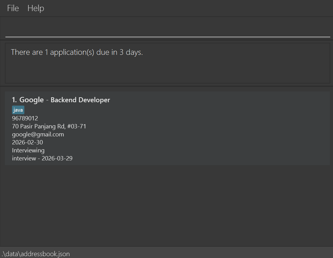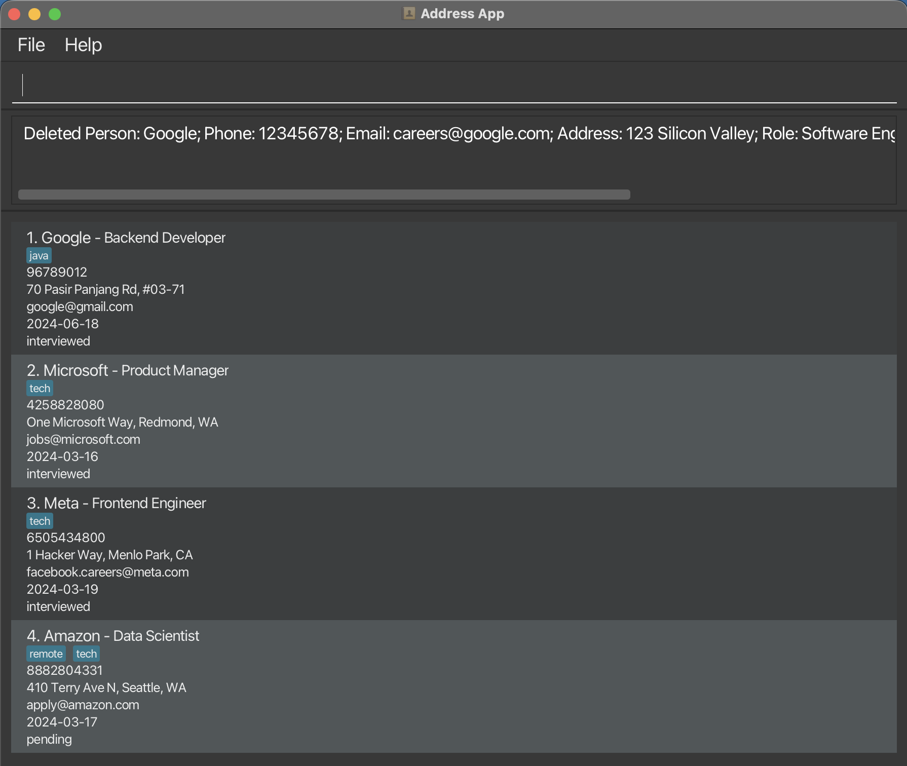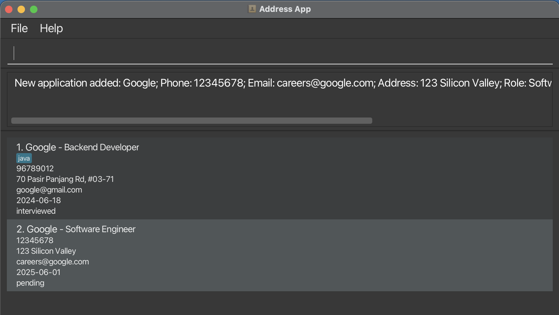 | Add | add n/NAME p/PHONE e/EMAIL a/ADDRESS d/DATE r/ROLE s/STATUS [t/TAG]... | add n/Google p/96789012 e/google@gmail.com a/70 Pasir Panjang Rd, #03-71 d/2024-06-18 r/Backend Developer s/interviewed t/java |