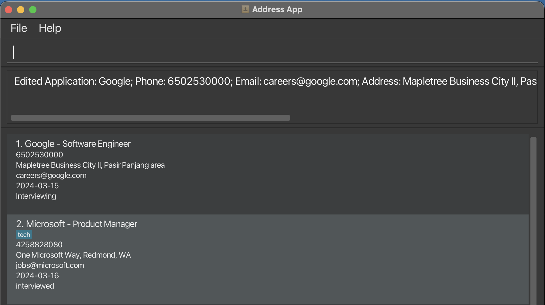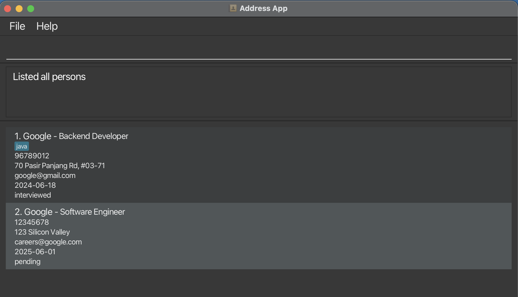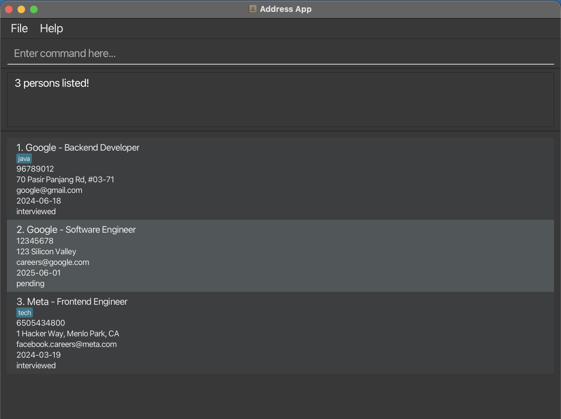 | Add | add n/NAME p/PHONE e/EMAIL a/ADDRESS d/DATE r/ROLE s/STATUS [t/TAG]... | add n/Google p/96789012 e/google@gmail.com a/70 Pasir Panjang Rd, #03-71 d/2024-06-18 r/Backend Developer s/interviewed t/java |