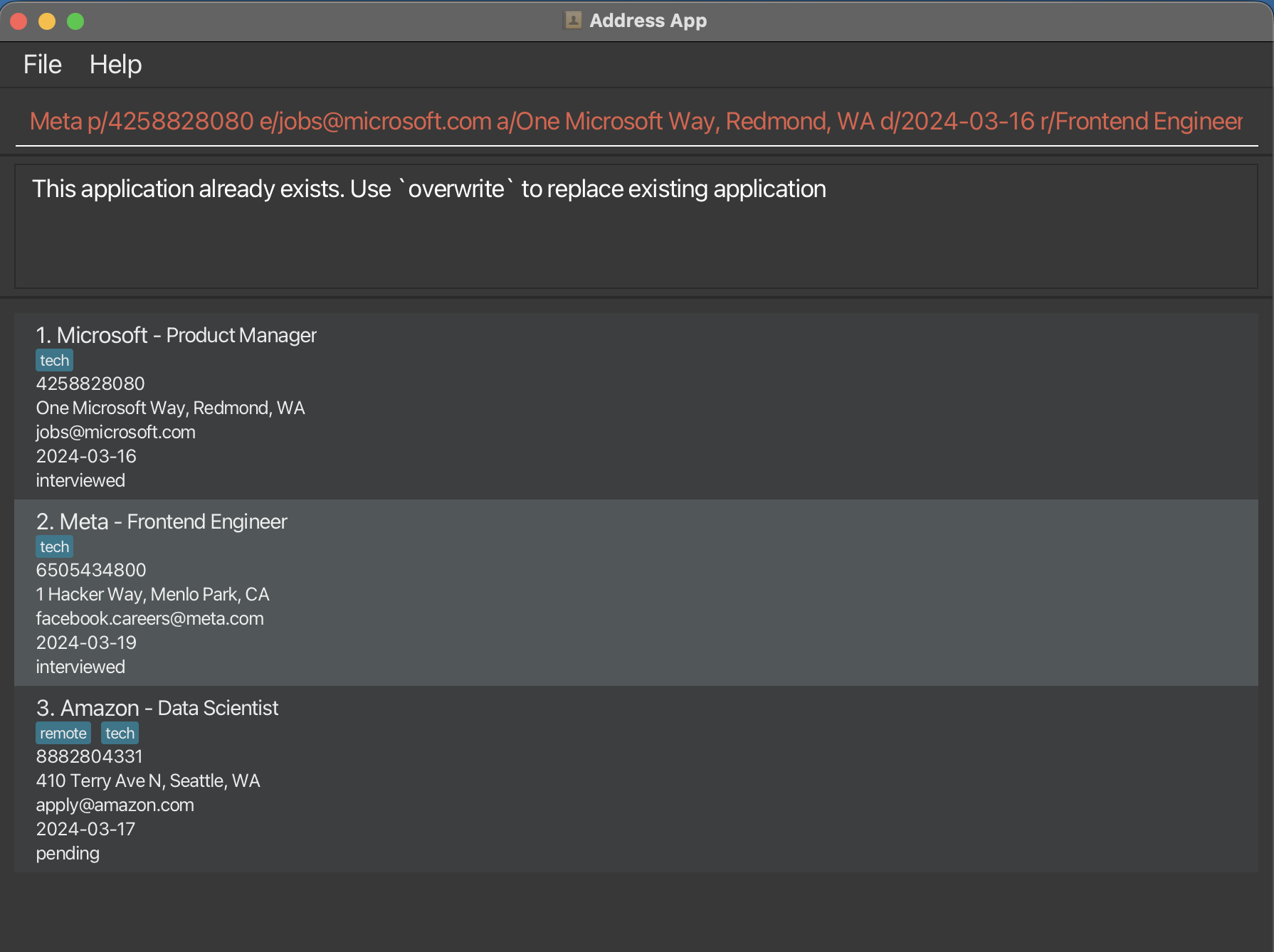 @ symbolYYYY-MM-DDadd n/Google p/96789012 e/google@gmail.com a/70 Pasir Panjang Rd, #03-71 d/2024-06-18 r/Backend Developer s/interviewed t/javaadd n/Google p/12345678 e/careers@google.com a/123 qSilicon Valley d/2025-06-01 r/Software Engineer s/pendingoverwriteCaution: OfferFlow by default does not allow duplicate application with same name and role. Hence, if you choose to add application with duplicate name and role, you can choose whether or not to overwrite it (ie: replace the pre-existing application with the new application)