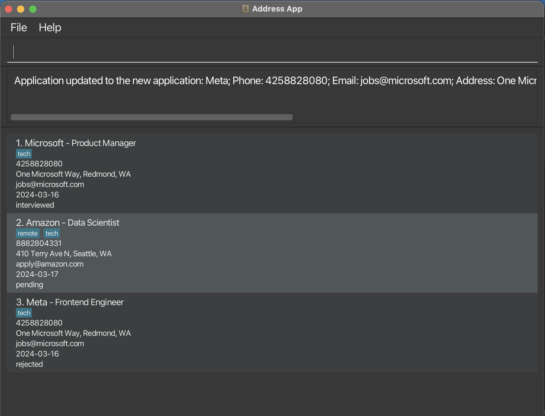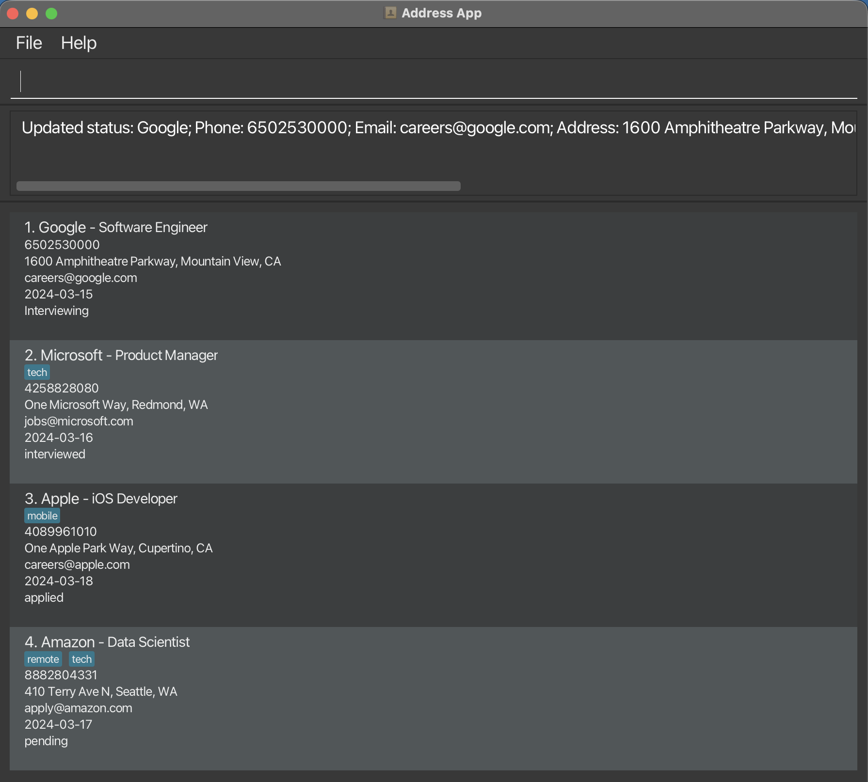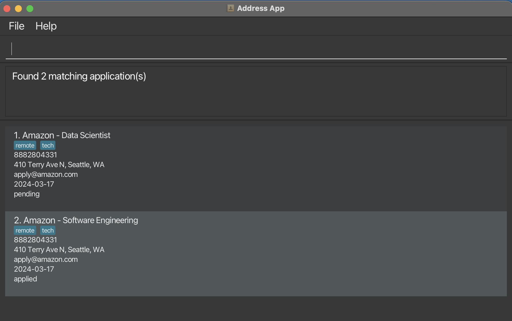 Tip: Status is case-insensitive (e.g. applied, Applied, APPLIED all work)